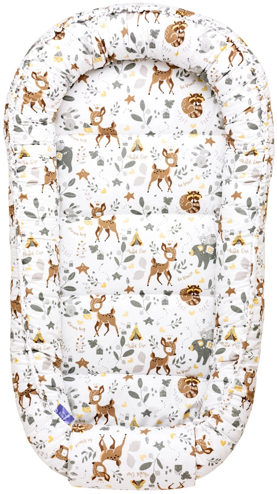 - un nid pour bébé à double face, mesurant à l’extérieur 65 x 120 cm, un espace de couchage de 40 x 90 cm, avec un bord de 15 cm