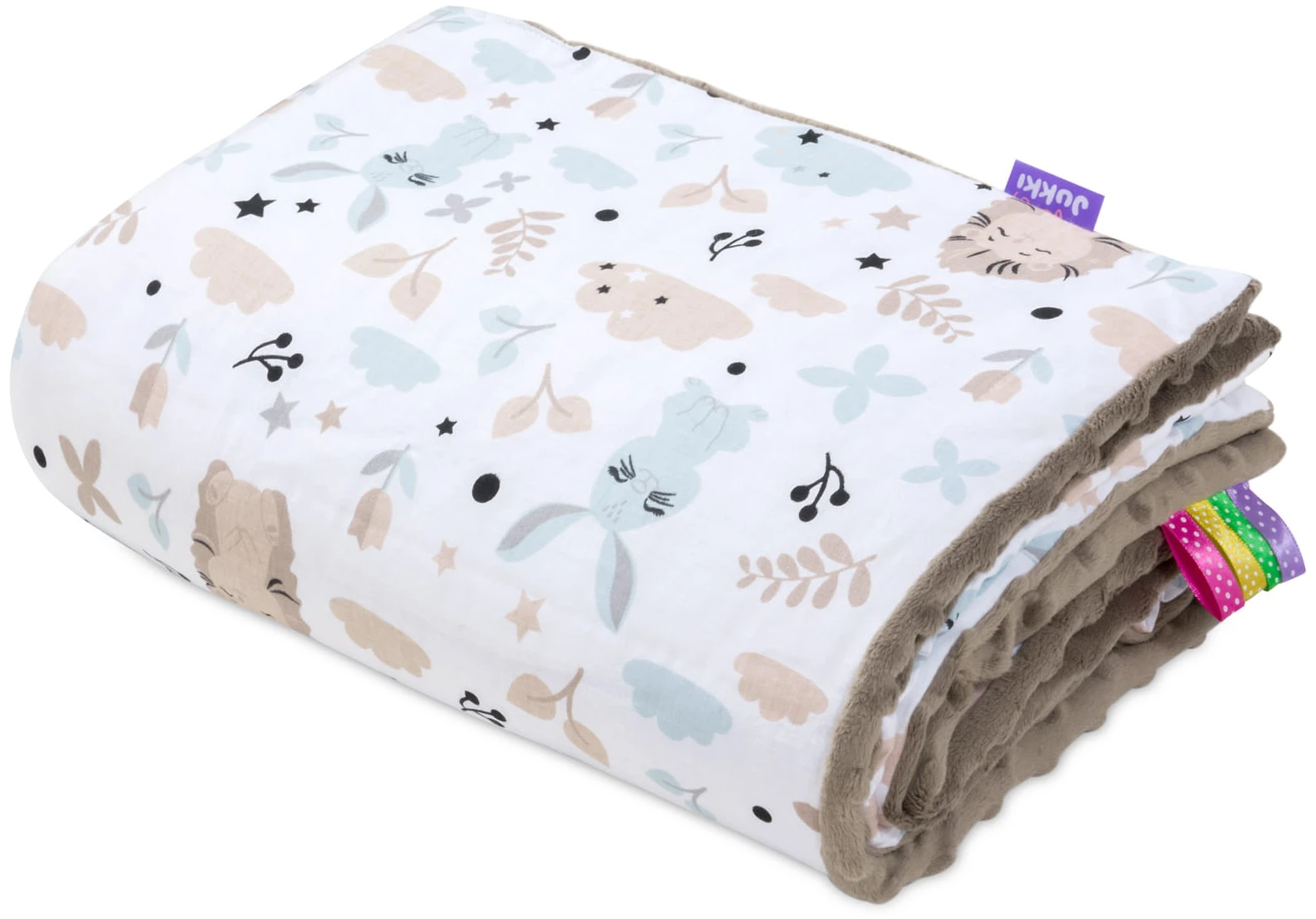 Les enfants adorent être câlinés et portés surtout les bébés. Notre couverture double face Jukki va câliner ton petit Bébé depuis les première jours de naissance. La couverture va lui mettre à l’aise et sentir en sécurité. Le matériel tendre fourni la commodité. Le bébé sera au chaud et confortablement. Fait de matériaux de haute qualité couvertures chaudes pour enfants sont tendres, agréable au toucher permettre de bons rêves. Délicatesse et douceur exceptionnelle au toucher, sont adaptées à la peau sensible de bébé et le confort de sa maman. Dans notre offre, chaque maman peut trouver les couvertures doubles face avec des motifs et dimensions amicales. Tellement mignon, produit devrait se trouver dans chaque layette pour les enfants. Les couvertures chaudes colorées pour enfants sont à double face et en coton certifié et en peluche Minky délicate. Ils se caractérisent par une surface extrêmement agréable au toucher qui câlinera chaque bébé. Ils ont été créés spécialement pour les bébés et leur rembourrage est constitué d’ouate certifié antiallergique Oeko-Tex®Standard100. Cela signifie qu’ils sont sans danger pour les enfants dès les premiers jours de leur vie. Les mères peuvent utiliser une telle couverture sans crainte à la maison et lors d’une promenade en famille. La combinaison d’un rembourrage anti-allergique et d’un extérieur 100 % coton garantit que nos couvertures doublent face ne provoqueront pas d’allergies et offriront à vos enfants un sommeil paisible et sain. La couverture a des rubans sensoriels colorés et cousus en toute sécurité qui intéresseront l’enfant et assureront du plaisir et stimuleront le développement manuel. Les couleurs des rubans peuvent différer de celles montrées sur les photos.