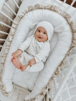 - Dans le lit bébé – le nid offre une protection contre les barreaux durs du lit, et les bords élevés du cocon permettent de coucher plus facilement l’enfant sur le côté, ce qui est très important, par exemple lorsque le tout-petit tombe,