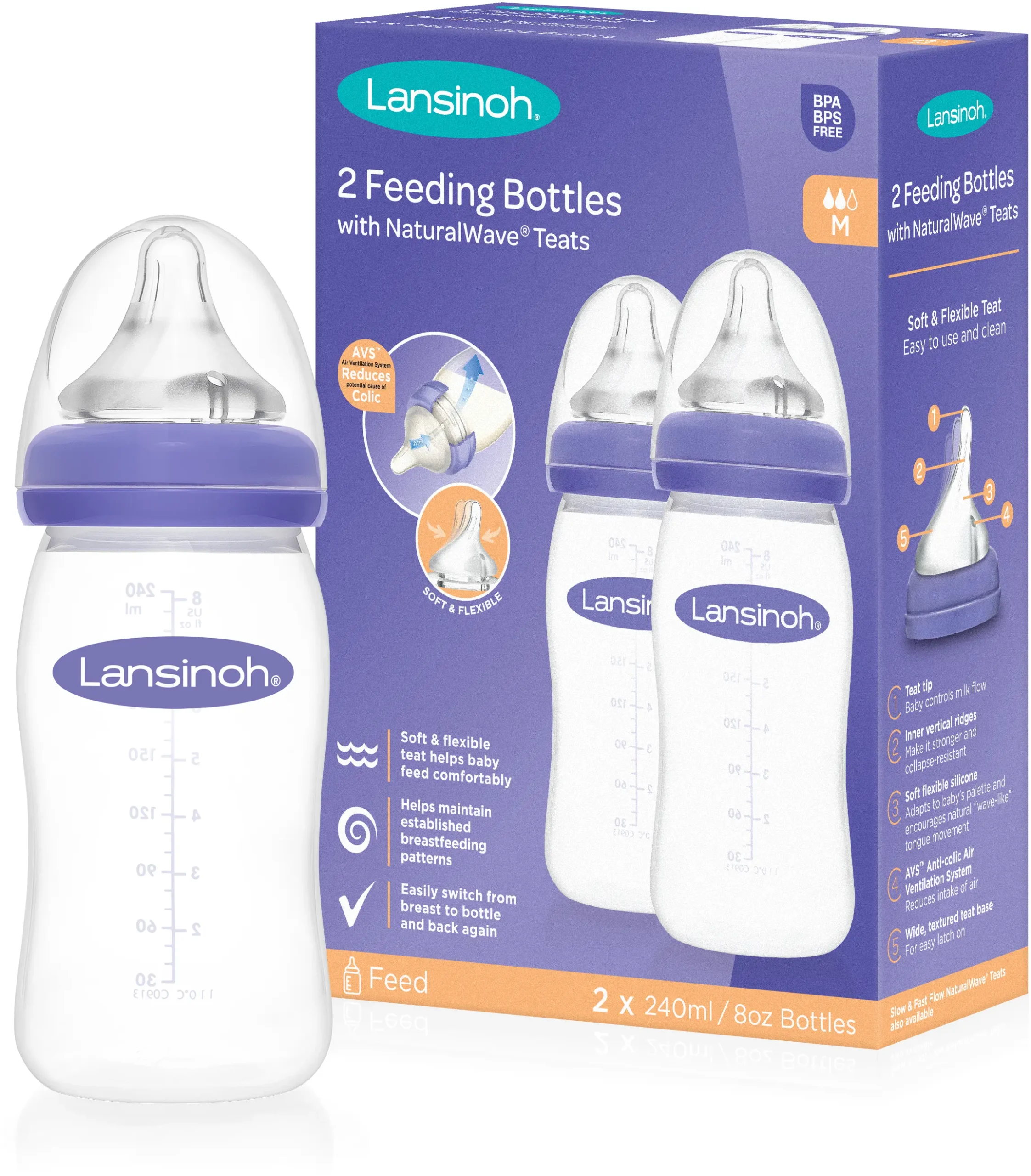 LANSINOH Biberon Avec Tétine à Débit Moyen – Natural Wave® – Duo Pack 2 X 240ml