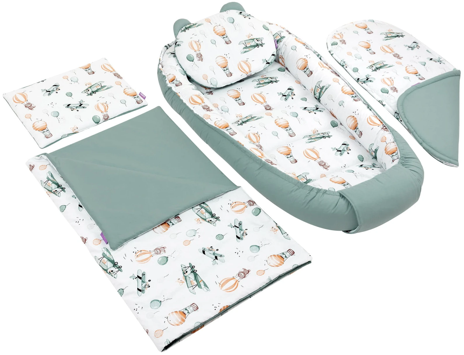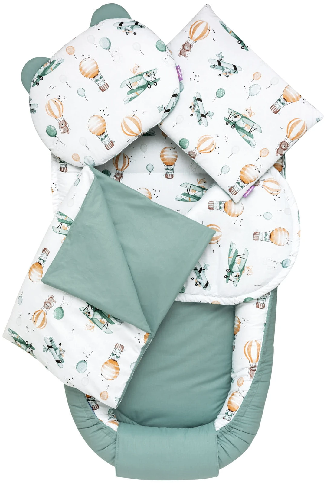 - Rembourrage non allergène : le matelas, le nid douillet, l’oreiller et la couverture sont remplis d’un voile de silicone 100 % antiallergique, ce qui prévient idéalement les irritations cutanées et maintient sa forme même après le nettoyage.