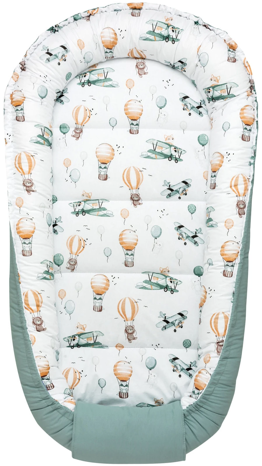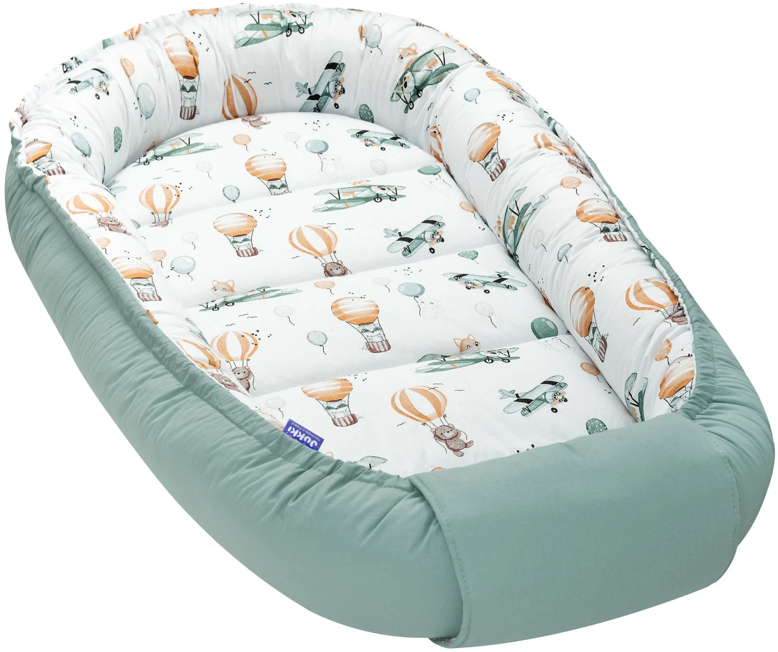 - un nid pour bébé à double face, mesurant à l’extérieur 65 x 120 cm, un espace de couchage de 40 x 90 cm, avec un bord de 15 cm